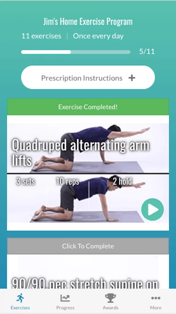 - Every exercise comes with a full video description, details for your reps/durations and an exercise-completion checkoff so your PT can see how committed you are to reaching your goals!
